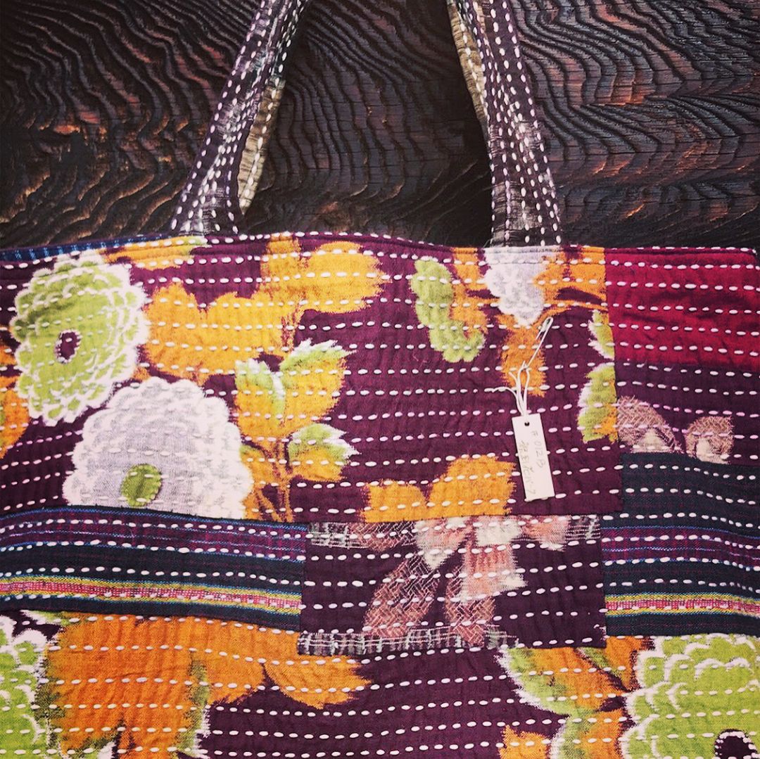 When we get a piece of beautiful & interesting vintage fabric, even if it is a small swatch, we keep them and try to patch and Sashiko. Simple running stitching can be a material of beautiful bag.