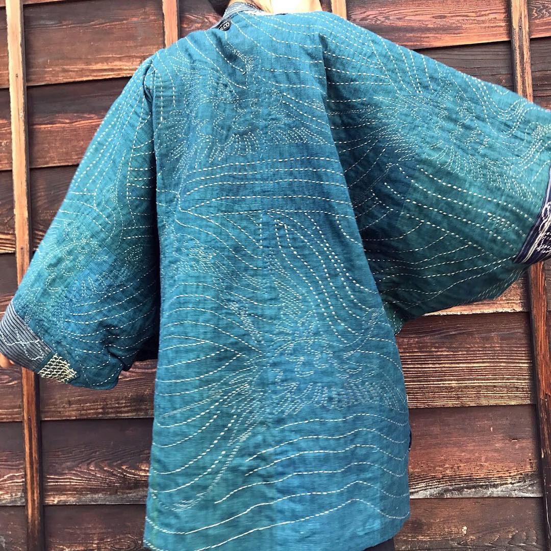 So called “Twin Jacket” of the previous Jacket I had introduced. These 2 jackets are made from the several kinds of same vintage fabrics. The vintage fabric Keiko couldn’t just put it in a drawer. She had to do Sashiko & bring back to the main stage as “cloth”. Reversible. A lot of “Boro to be fabric” and of course, Katazome crane on the front and Sashiko Crane inside of the Jacket. ★