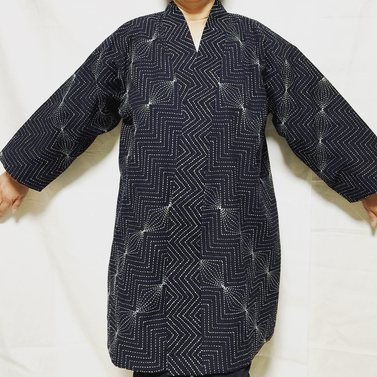 一目刺し。様々な古布への刺し子。自信を持ってお届けしている作品達です。同時に、一番”落ち着く”のは、点(針目)が走り線となり、線が集まってできる幾何学模様から作られる刺し子ジャケットです。これを「芸術」と呼ぶ人もいるとは思いますが、僕にとっては芸術という非日常ではなく、実家のような思い出の中にある日常です。どちらが良いという話じゃなく、「これを塗り替えられないように伝えていく」という意思表明のお話です。やっぱり帰る場所は守りたものですから。